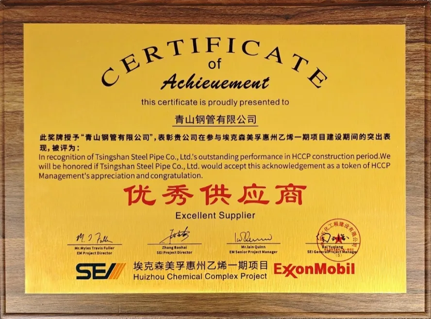 近日,青山鋼管有限公司憑借其卓越的產(chǎn)品質(zhì)量、專業(yè)的技術(shù)實力和及時高效的售后服務(wù),榮獲中石化SEI埃克森美孚惠州乙烯一期項目的“優(yōu)秀供應(yīng)商”稱號。